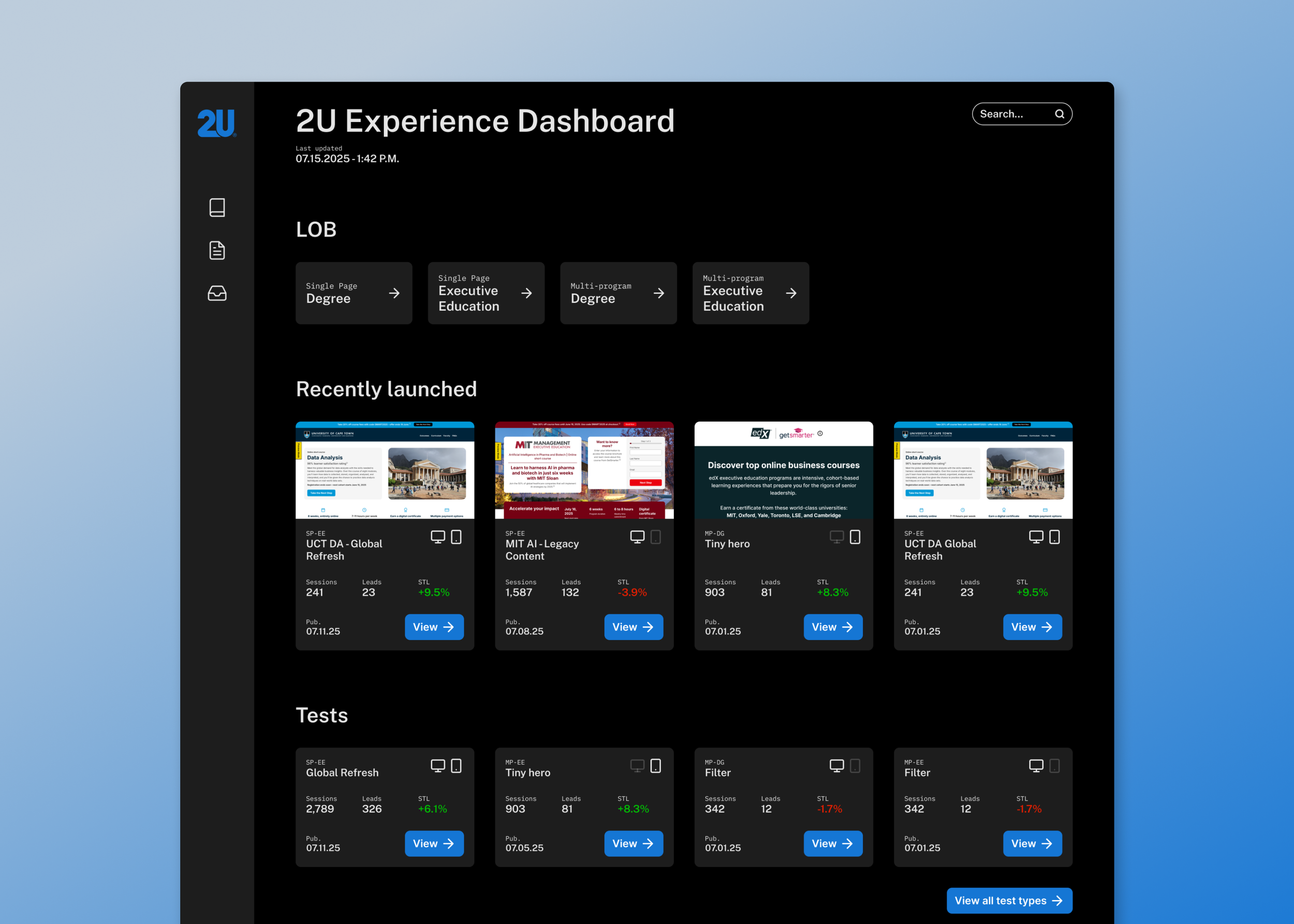 Categorizing our experiences by their LOB (line of business: single-page, multi-program), test type, and school allows our team and partner to find what they’re looking for quickly. Each category has a specific set of filters and a search function to allow for efficient browsing and sorting. Providing access to performance data and project information keeps our team informed on any page.